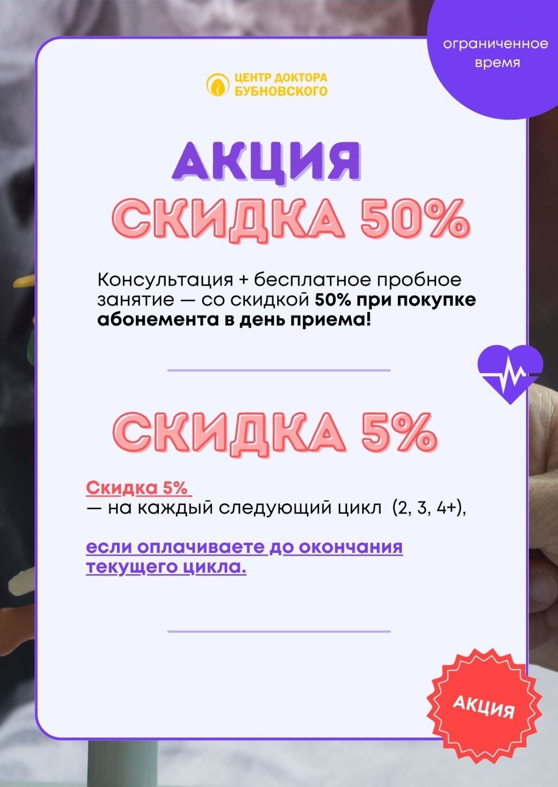 Консультация + бесплатное пробное занятие — со скидкой 50% при покупке абонемента в день приема!